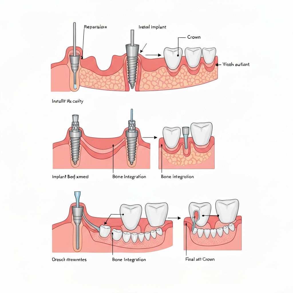 Un implant dentar este un șurub din titan (sau zirconiu) introdus chirurgical în osul maxilar sau mandibular. Servește ca rădăcină artificială pe care se fixează o coroană dentară. Titanul este biocompatibil – osul crește în jurul lui (osteointegrare) ancorând implantul permanent.